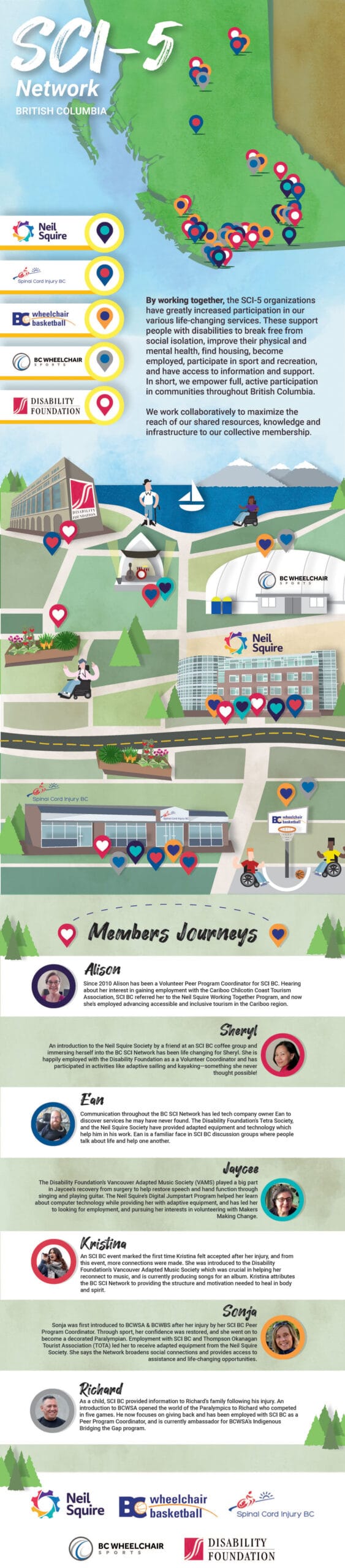 Formed in 2010, the BC Spinal Cord Injury Network (BC SCI Network) is comprised of five disability organizations working together to help make BC the best place for people with physical disabilities to live, work, and participate in the community. These organizations include Spinal Cord Injury BC, BC Wheelchair Sports Association, BC Wheelchair Basketball Society, The Disability Foundation, and the Neil Squire Society.