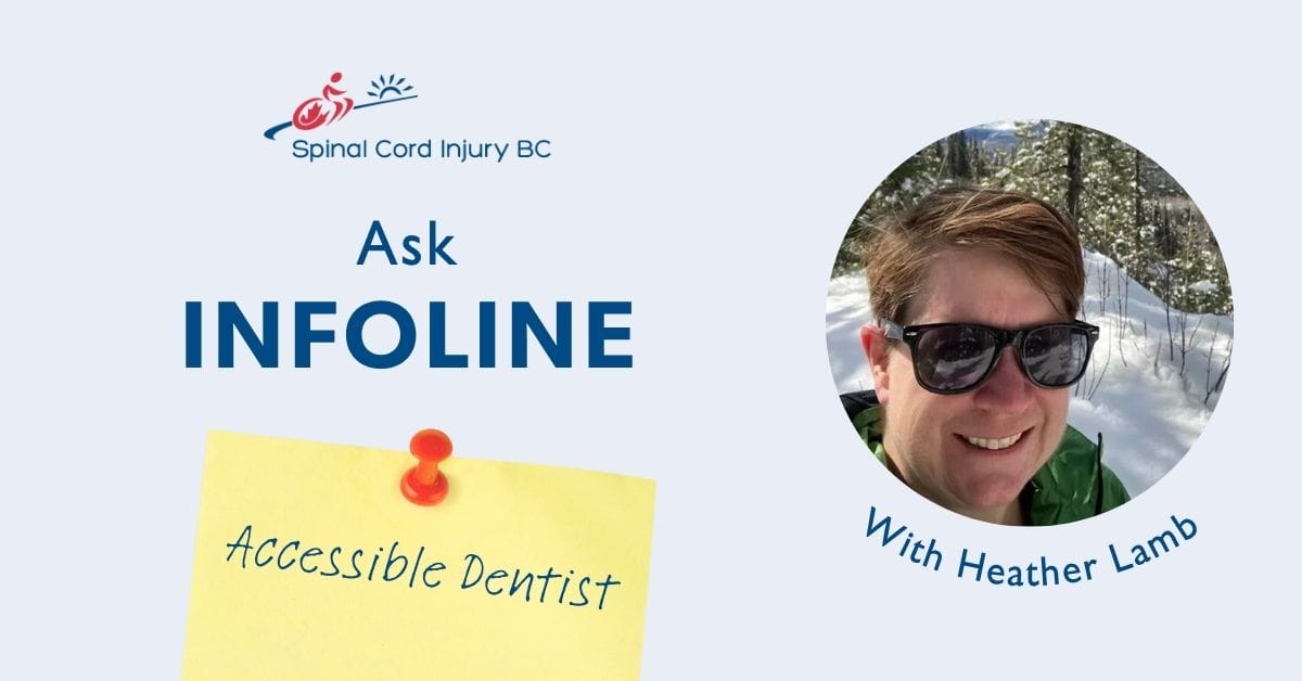 SCI BC’s InfoLine team is here to help you find an accessible dental practice near you, apply for the new dental care plan, and any other questions you have about living with a physical disability in BC. Don’t hesitate to call or email us at any time. 1-800-689-2477 or info@sci-bc.ca.